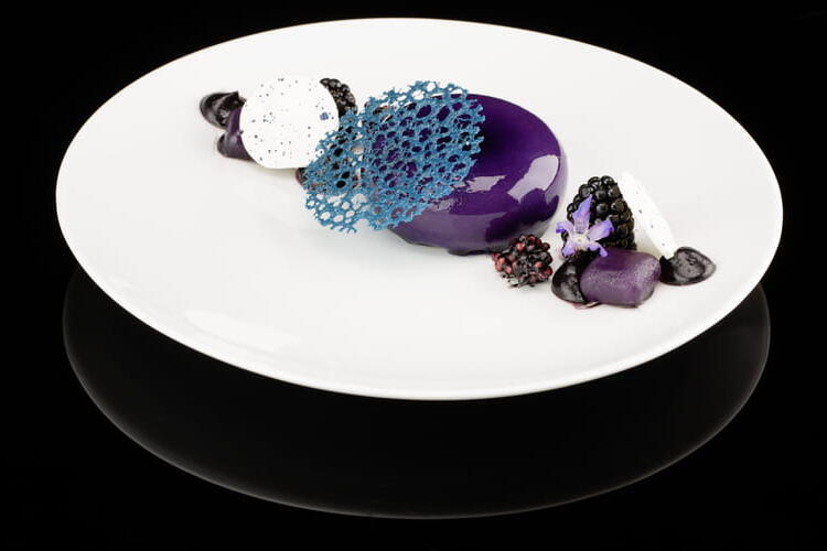 Prepare the perfect blackberry mousse: cook the sugar and water to 120°C, pour over the egg yolks and whisk. After cooling, add the juice mixed with gelatin (the mixture must be cold) and then the whipped cream. Pour into molds and freeze.