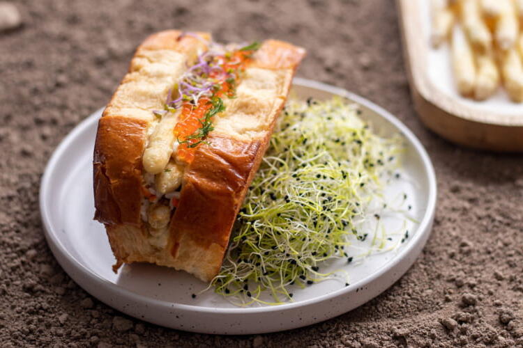 For a sandwich that is different from ham and butter, try this recipe for an asparagus roll with crab and trout roe. I promise you will enjoy it.