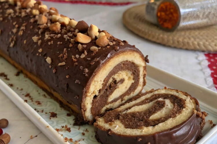 An elegant and ultra-indulgent dessert to elevate your celebrations! This log combines a soft cocoa biscuit, a melting ganache, and crunchy hazelnuts. It is all topped with chocolate-covered treats for a festive and irresistible touch.