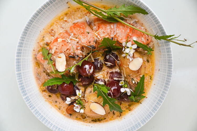 Lobster tails served with potatoes and sour cherries. A recipe created by chef Fanny Rey. Photo credit: Fanny Rey – Photographer: Thierry Teisseire.