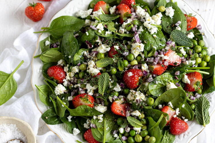 A blend of spring flavors, this salad of spinach leaves, strawberries, red onion, peas, and feta is a true delight.