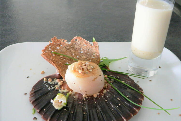 This delicate appetizer will delight the taste buds with its perfectly golden scallop, a buckwheat galette accompanied by a cream infused with the scents of the sea… made with the beard of the shell.