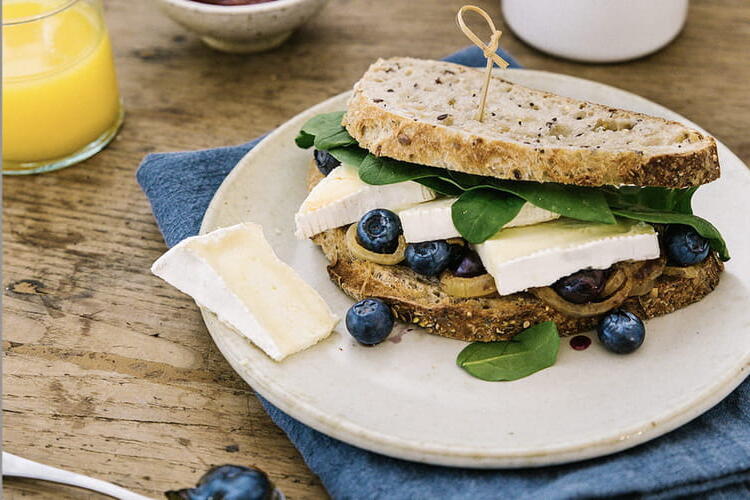 A delightful recipe for a cheesy croque with camembert, blueberries, caramelized onions, and spinach sprouts for a flavorful gourmet brunch! Ready to please your guests?