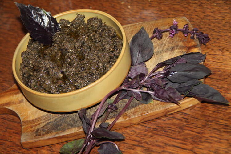 A handful of flowering purple basil and several purple branches of kale in my organic basket… The idea of a pesto came to me right away! Sure, the color is a bit unusual, but it tastes so good!