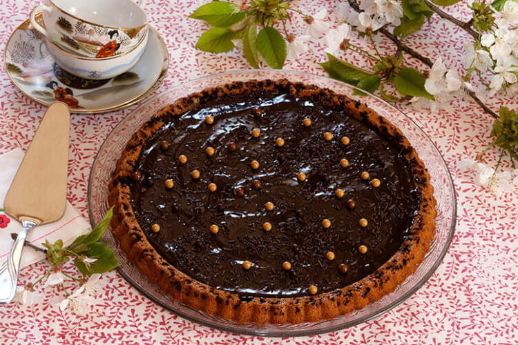 A tiger-striped tart filled with a delicious chocolate ganache. Made in an upside-down tart pan,