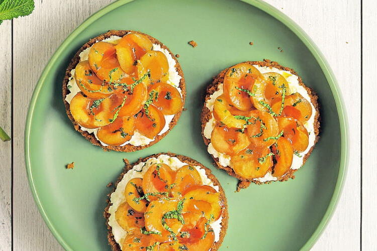 Recipe for Plum Tartlets without an oven, with mint butter, fresh cheese, and spiced biscuits.