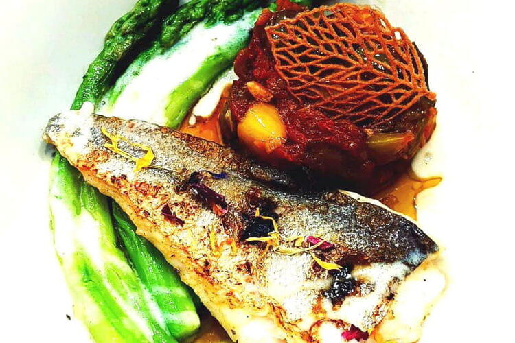 Here is a seasonal recipe with asparagus and a filet of fish with black garlic, all good for health. This recipe was inspired by a recipe from a chef. Served with edible decorative leaves with black garlic and some dried flower petals.