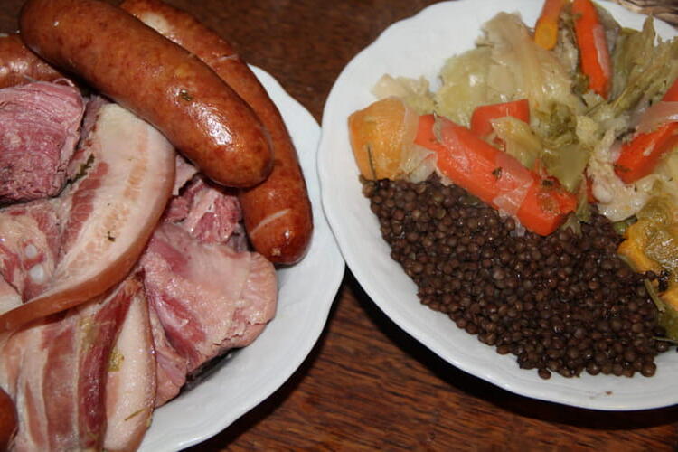 Recipe for cabbage and lentil stew with its smoked meat, knuckle, sausages.