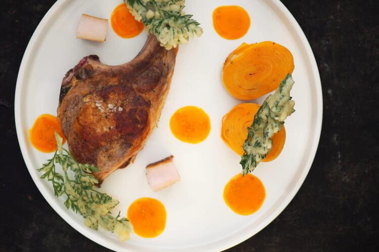 Don’t know how to cook a pork chop? Try this recipe for farmhouse pork chop, sweet potato spirals, and potato with tangy carrot juice and mustard seed.