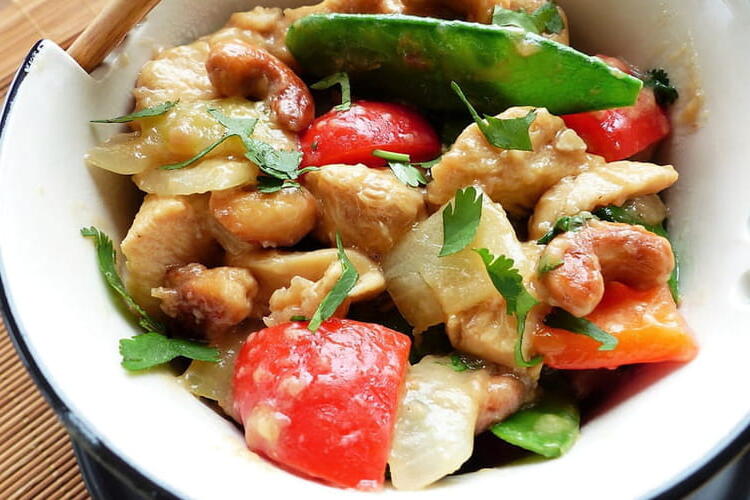 A recipe with Asian flavors, sautéed chicken with cashews. If, like us, you don’t have Chinese yellow wine, white wine or even beer will do the job.