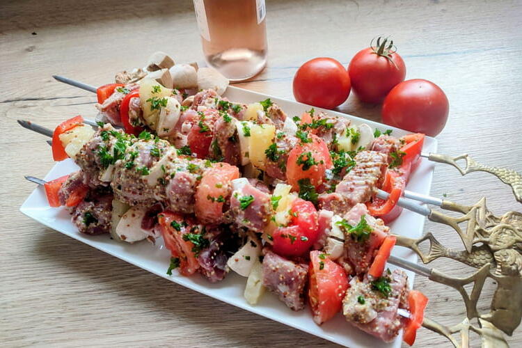 Spicy skewers that can be made with pork or veal tenderloin. You can vary the ingredients by substituting the bacon with chicken livers, for example. Serve with potatoes cooked in barbecue ashes or pilaf rice.