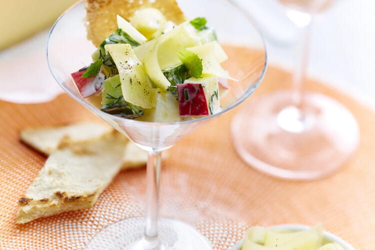 For the mint apple and cucumber tzatziki: Peel the apples and the cucumber. Cut the apples and cucumber into 2 cm cubes. In a bowl, mix the Greek yogurt with fresh mint and chopped dill, seasoning with salt and pepper. Then add the cucumber and apple cubes to the yogurt. Finish with a drizzle of olive oil.