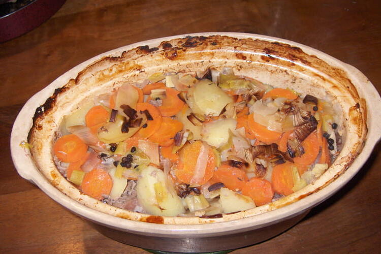 In the buttered dish, layer successively: 1 layer of onions, 1 layer of potatoes and carrots, the pieces of meat, the split pig's foot, 1 layer of potatoes and carrots, the leek. Salt and pepper each layer.