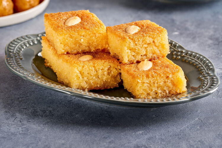 Basbousa is a Middle Eastern pastry made from fine semolina and almonds, traditionally served during Ramadan evenings. It is enjoyed with family or friends, accompanied by mint tea.