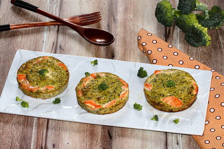 To finish, preheat the oven to 180°C. Grease tartlet molds if they are not silicone. Fill halfway with the broccoli mixture. Cover with slices of salmon. Top with the remaining broccoli. Bake for 30 minutes.