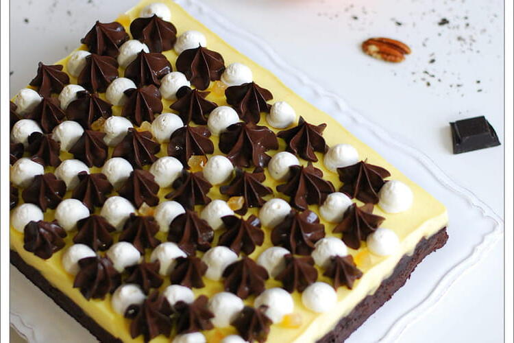 No need to be a professional pastry chef to succeed with this lovely checkerboard cake. With its melting and powerful chocolate brownie base that balances wonderfully with the layer of no-bake orange custard, white chocolate whipped cream, and chocolate cream, you'll delight both kids and adults!