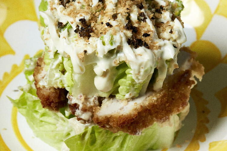 To finish, place your sliced salad on this layer and arrange your small mushrooms all around. Fill a piping bag with the remaining Caesar dressing. Create as artistic lines as possible with it. Sprinkle everything with capers, a scattering of fried panko, and a heap of grated Parmesan.