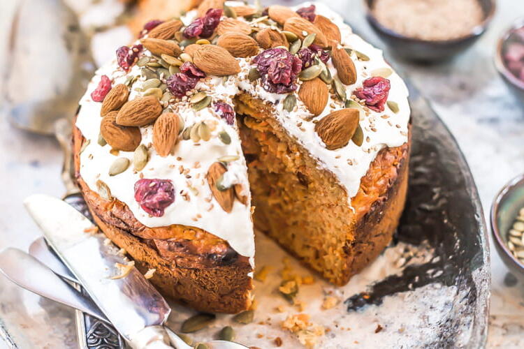 Let the carrot cake cool completely. Meanwhile, prepare the frosting by mixing Greek yogurt and honey. Once your carrot cake is completely cool, spread the frosting and sprinkle again with seeds, cranberries, almonds, and honey. Refrigerate for a few hours.
