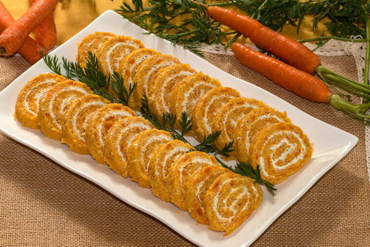 Meanwhile, soften the fresh cheese. Unroll the carrot sponge cake and spread it with garlic and herb cheese. Roll it up tightly again and wrap it, leaving it in the refrigerator for at least 2 hours. Then, cut it into slices and enjoy it chilled.