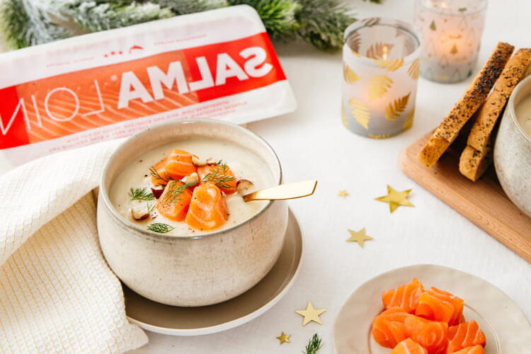 Ladle the soup into bowls. Add the salmon cubes and the crushed hazelnuts.