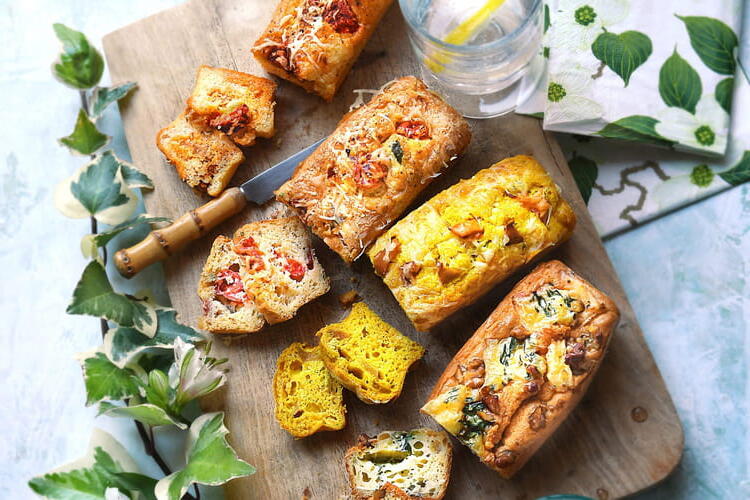 Separate the dough into 4 equal parts. Incorporate into the first: 100 g of grated cheese and 10 slices of sausage. Into the second: 100 g of blue cheese, 80 g of shelled walnuts. Into the third: 100 g of cheese, 1 diced apple, and 1/2 teaspoon of curry. And into the last: 2 crumbled goat cheeses, 8 diced sun-dried tomatoes, and 5 sprigs of thyme, leaves removed.