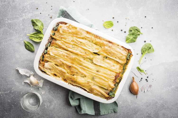 Peel the shallots and garlic and chop them. Melt 20 g of butter in a pan, then sauté the shallots and garlic for a few minutes. Add the spinach and let it wilt.