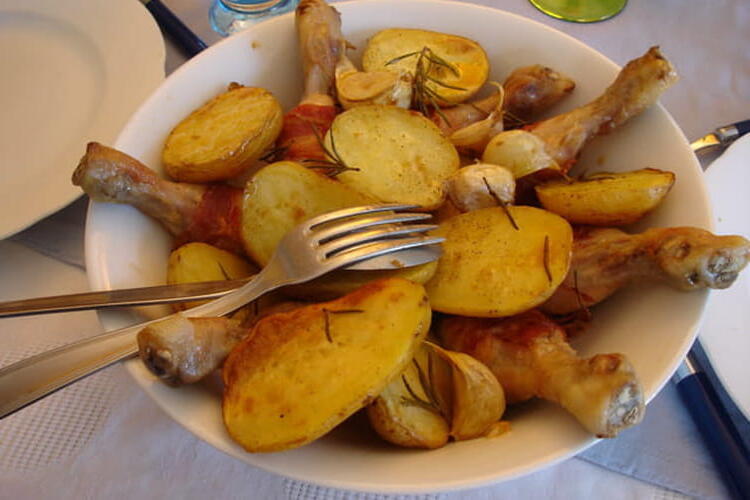 Arrange the drumsticks in the baking dish (I place them in the drip pan), mixed with the halved potatoes that should rest at the bottom, whole garlic cloves, and rosemary chopped into small pieces. Season with pepper and salt, pour in the wine. Drizzle with a thin stream of oil.