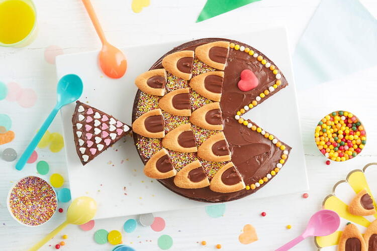 Place a sugar heart to create the eye. Arrange the mini candies evenly around the edge of the cake to represent the fish's face.