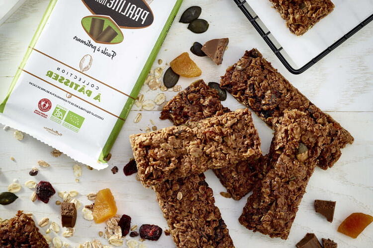 Chop the chocolate into small pieces to make chips. In a bowl, mix the oats, chopped dried fruits, and chocolate chips.