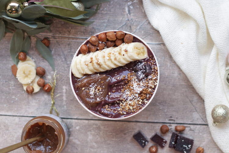 Blend 2 packets of açaí with a splash of water, 1 banana, and 1 tablespoon of honey.