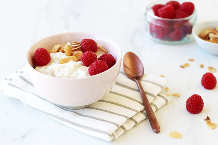 Coconut milk rice pudding with raspberry and almond.