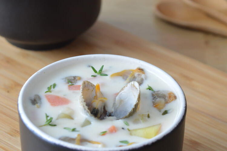 A creamy soup with large pieces of vegetables, cream, and good clams. Known as "Chowder" in America, it is usually made with clams. However, it can also be cooked with cockles (like here) or even a mix of seafood.
