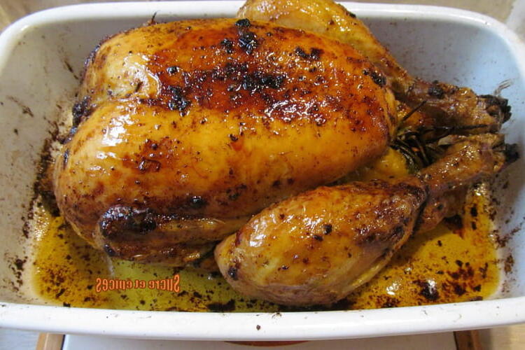 Bake and cook for 1 hour, basting every 15 minutes to prevent the garlic from burning and to keep the chicken juicy. Halfway through cooking (after 30 minutes), before basting, turn the chicken so that the underside browns as well. Then, for the next basting after 15 minutes, turn the chicken back to breast side up for the last 15 minutes.