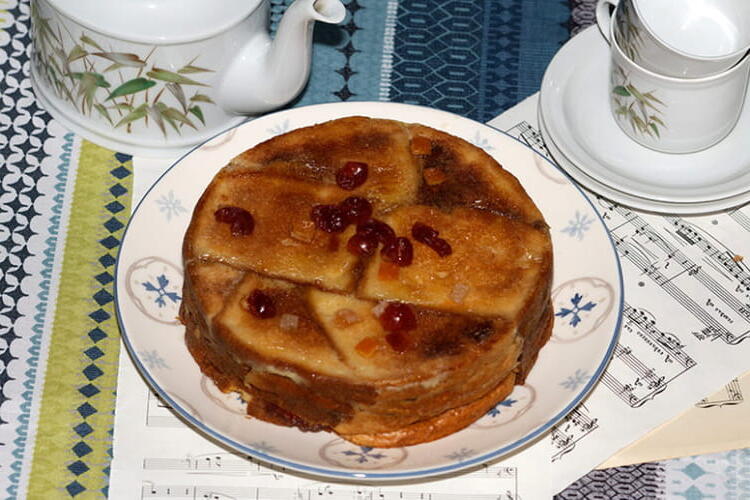 Pour the contents of the bowl into the charlotte mold, sliding a knife around the fruit bread to ensure it is well soaked in the egg mixture. Bake in a water bath in the oven for 1 hour.