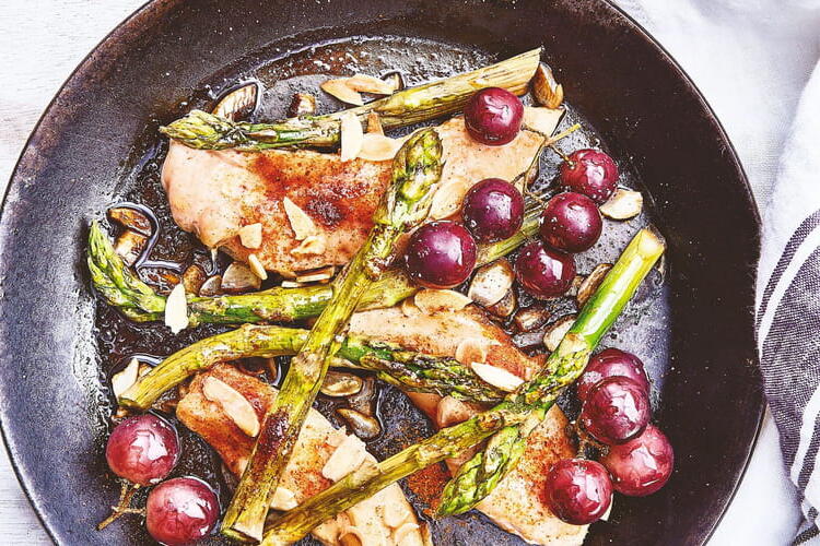 Deglaze with soy sauce, then add the asparagus and grapes and bake for 15 minutes.