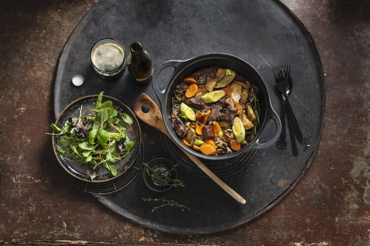 Melt the remaining butter in the saucepan, add the shallots, carrots, and parsnips, and sauté for 3 minutes. Add the herbs, spices, and beer.