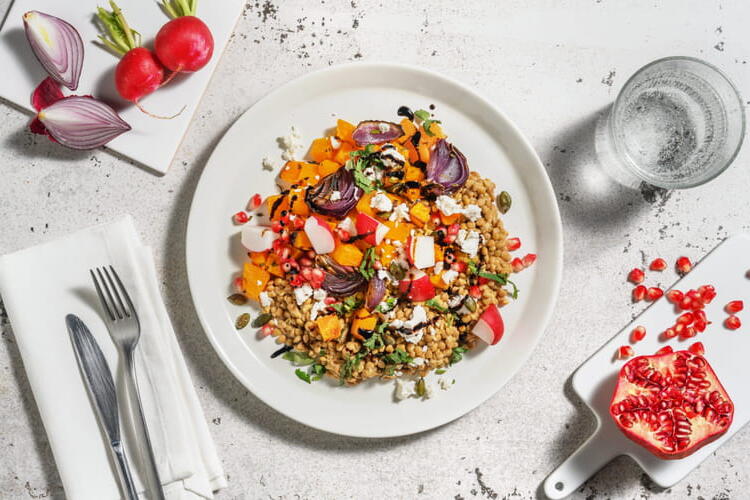 To finish, mix the roasted vegetables with the lentils and season everything with the vinaigrette. Serve the salad onto the plates. Crumble feta on top and sprinkle with chopped herbs, cashews, and pomegranate seeds.