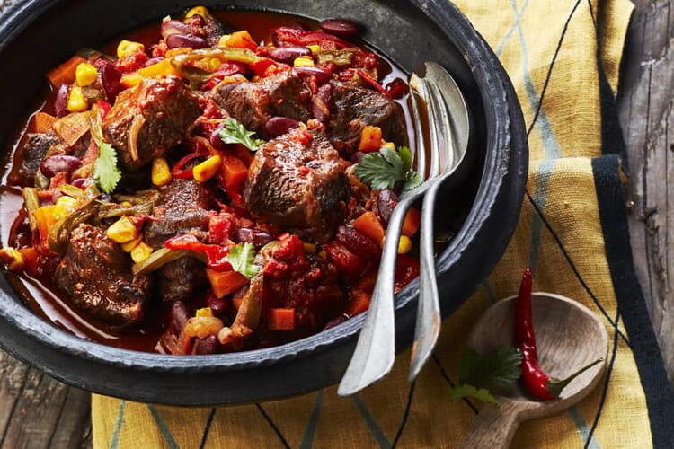 Cut the beef cheek into cubes, drain and rinse the corn, remove the seeds from the peppers and cut them into strips, peel the carrots and cut them into small dice, peel the onion and slice it finely, remove the seeds from the chili and cut it into thin rounds, peel the garlic and remove the germ.
