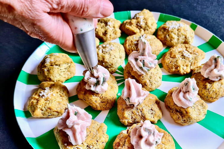 To finish, prepare the sauce: mix the mayonnaise with the chopped white of the hard-boiled egg. Add the wild garlic and/or chopped parsley. Mix well. Plate by placing a slice of the dish, a little sauce, and garnishing with edible flowers.