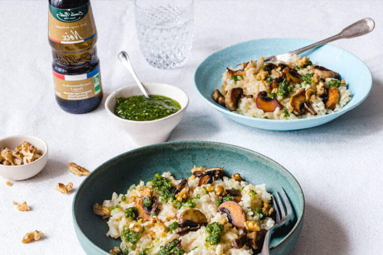 Head to Italy with this delicious recipe for mushroom risotto with nut pesto.