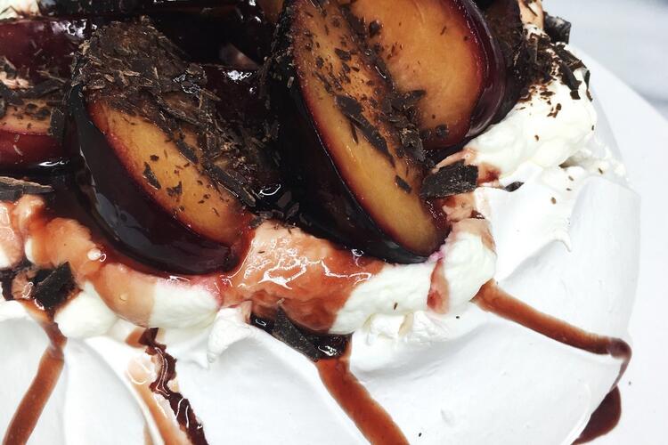 This Pavlova topped with sweet poached plums and sprinkled with chocolate shavings is the ultimate crowd-pleaser.