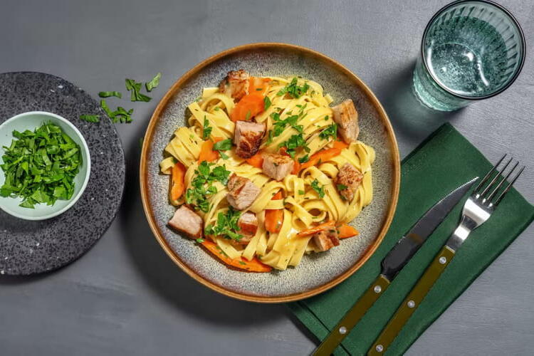 This recipe for mustard pork with tagliatelle, carrots, and parsley is super simple to prepare. Perfect for quick meals!
