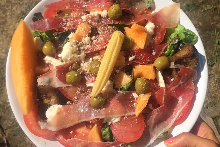 Cut the mozzarella into small cubes and distribute them over the salad, then add the sun-dried tomatoes and the ham sliced into thin strips. Arrange the olives, the corn on the cob (optional), and finish by placing the slice of melon on the side.
