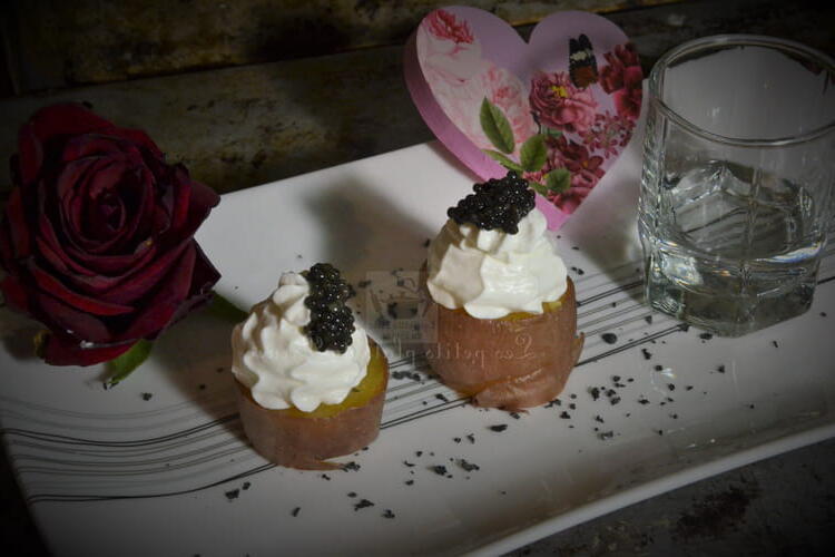 For our Valentine's Day, I wanted to discover with my partner the flavors of a dish that's said to be exceptional: caviar! For the appetizer, I prepared a very simple amuse-bouche, but in my opinion, very elegant: these small potato bites are topped with a dome of whipped cream enhanced with vodka and finished with a touch of caviar.