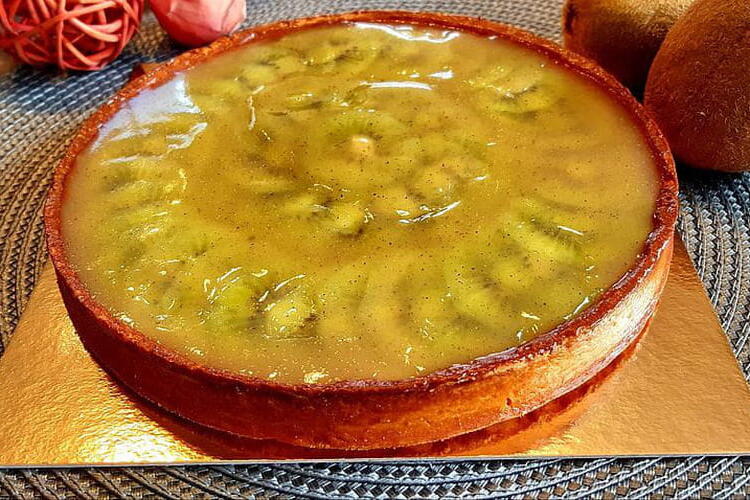 To finish the preparation of the glaze: Blend the pieces of 55 g of kiwi with 100 g of water. Strain the resulting juice several times through a fine sieve to obtain a very clear juice. Pour it into a saucepan and add 30 g of sugar, a packet of vanilla sugar, and agar-agar. Bring to a boil for 10 seconds, then let it cool to about 50 °C. Pour the glaze over the tart and refrigerate for at least 30 minutes.
