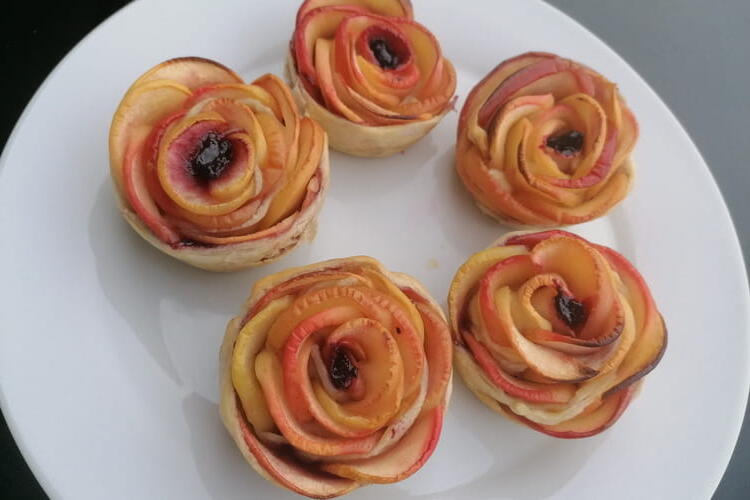 To finish, upon taking them out of the oven, lightly dust them with powdered sugar. Add a small spoonful of blackcurrant jam in the center of the flower. Enjoy!
