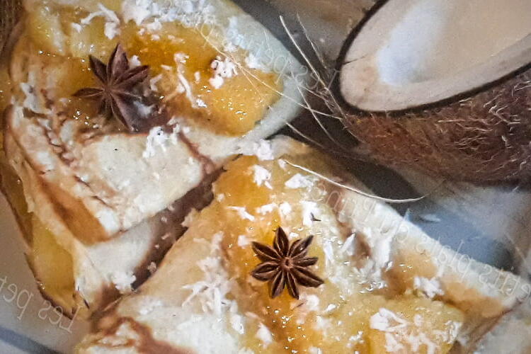 To finish, when the flames have gone out, remove the star anise. Place the crepes in front of you. Put half a banana on top and drizzle with the rum sauce. Fold into quarters. Place the other half of the banana, drizzle with the sauce, and sprinkle with shredded coconut. Serve hot.
