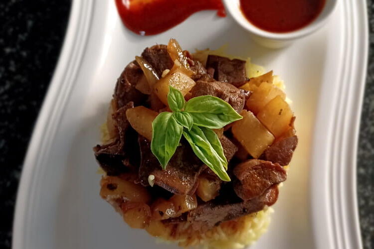 Meanwhile, peel and finely slice the onion. Sauté it until it melts and browns in a pan with 1 tablespoon of fat (rendered from a cooked dish).