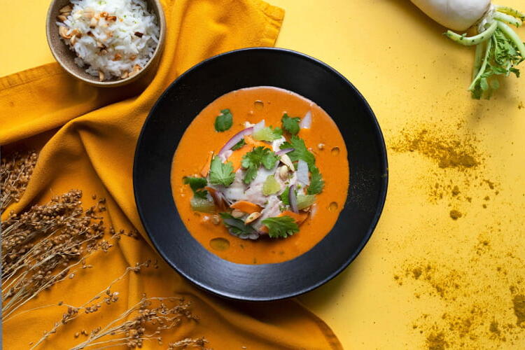 To finish, in a shallow bowl, place the rice, vegetable tagliatelle, and the brain. Generously drizzle with curry sauce. Add a few cilantro leaves, small pieces of lime, and red onion petals. Enjoy your meal!