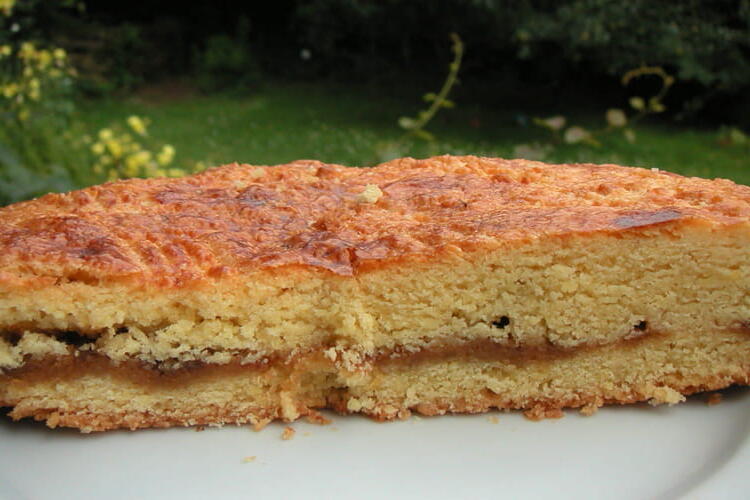 Cake preparation: mix the flour, sugar, and baking powder. Add the egg, 3 yolks, and softened butter. Mix thoroughly by hand. Put half of the mixture into a greased cake pan (the dough resembles a slightly sticky shortcrust pastry).